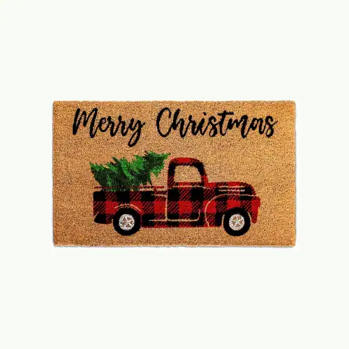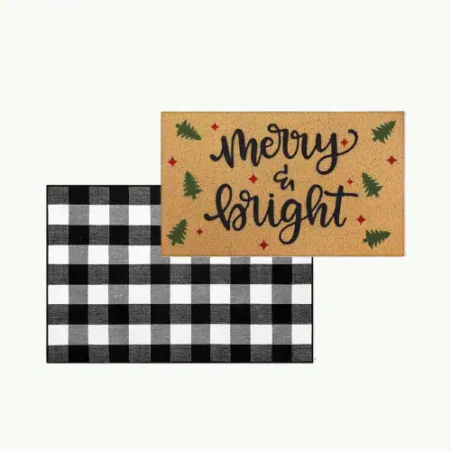 To get this look, start with a Merry Christmas rug layered under a simple checkered mat. Add two small trees or topiary bushes to each side of your door. Wrap a garland around your frame and add a few red velvet bows or mini bells for that final touch. Then, hang a wreath with subtle gold or cream accents to keep it balanced.
