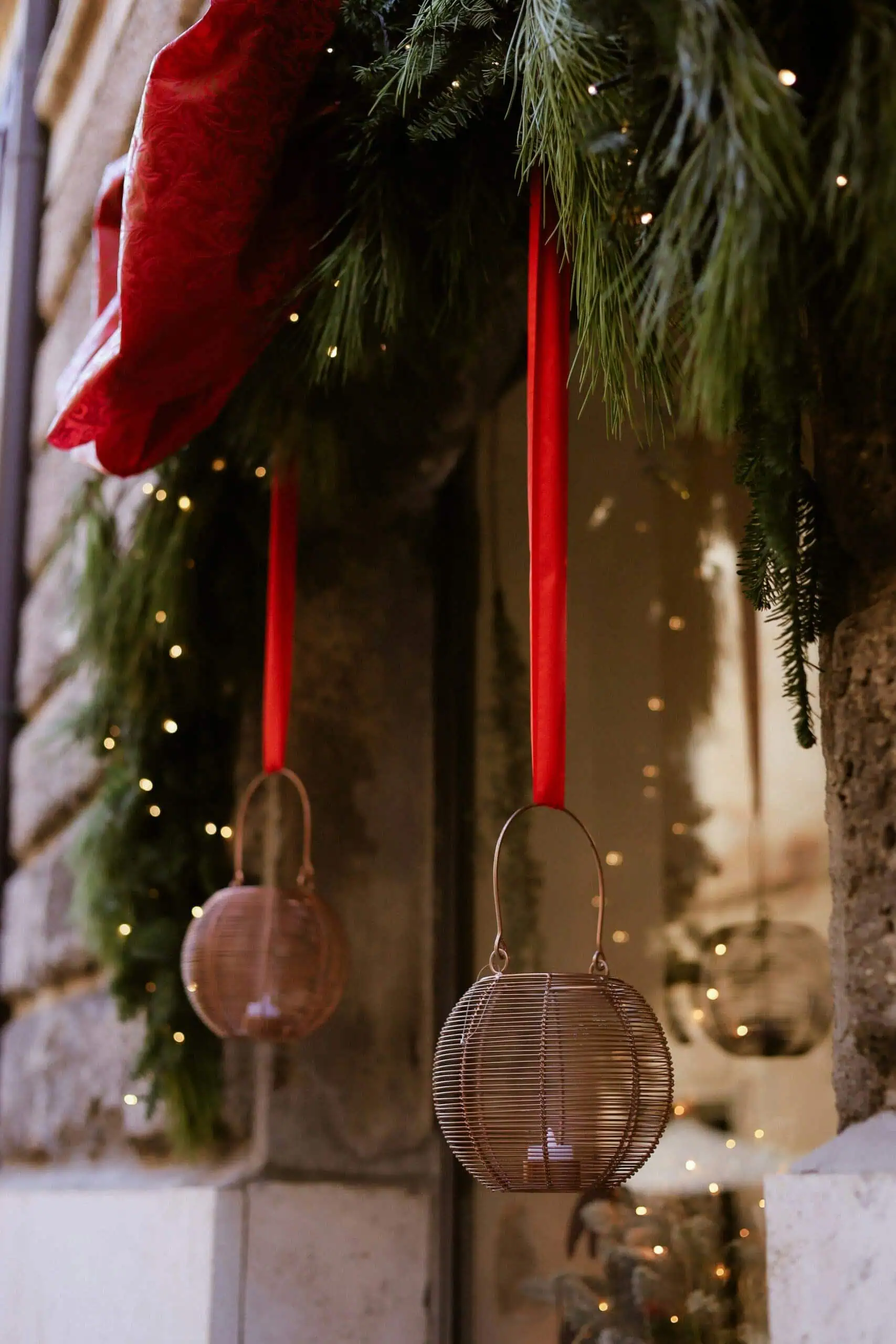 To recreate this, start with neutral tones and soft textures. Add a few large lanterns with battery candles for warmth. Place a couple of potted pine trees by your doorway and hang a simple green wreath with a beige or ivory ribbon. You can even add a small Joy or Peace sign to finish the look.