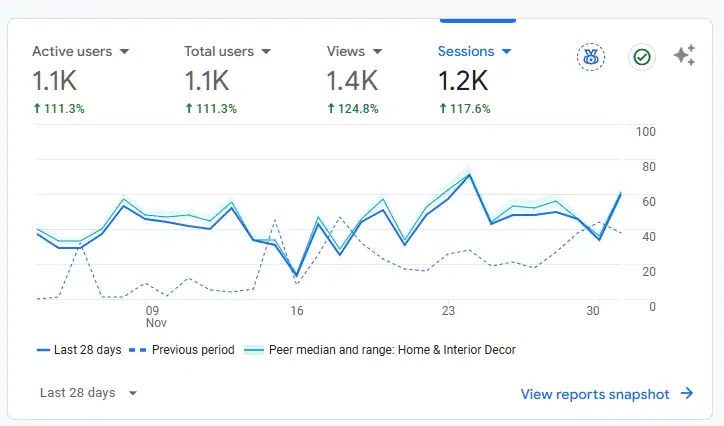 Right now I am at 1.2k sessions but a huge chunk of that is traffic from China and Singapore. It is not real traffic which means I cannot really see my true audience yet but even with all of that noise, I crossed the one thousand session mark in November.